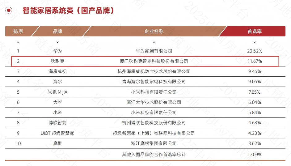今年,狄耐克智能家居首选率为11.67%,位列榜单第二名,首选率再次提升。