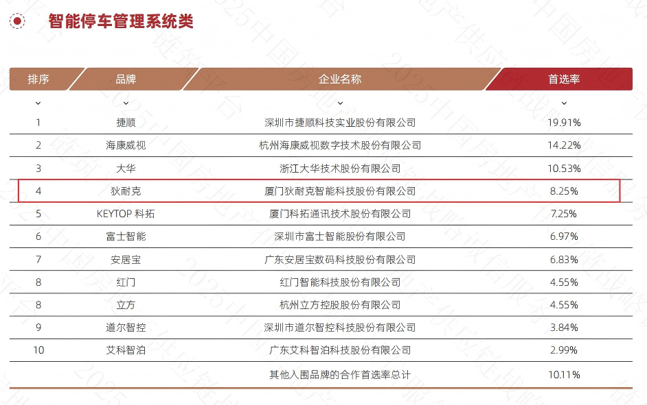 在智能停车管理系统TOP榜单评选中,狄耐克位列第四名。