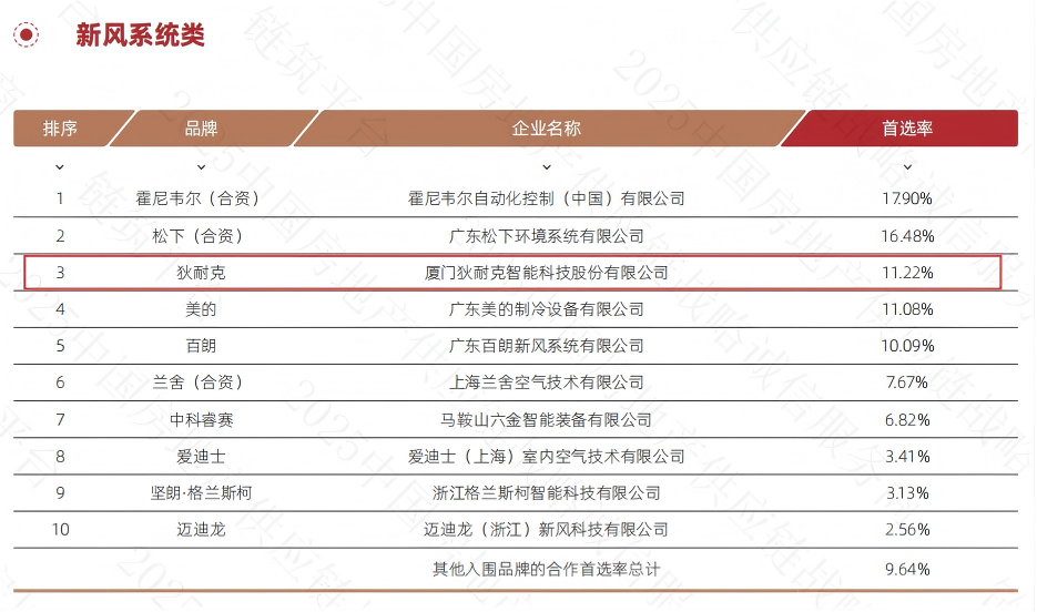 狄耐克以11.22%的首选率位列新风系统类榜单第三名。