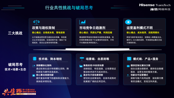 面对当前低速无人车行业普遍面临的政策路权限制、市场竞争加剧、盈利模式尚在探索等共性挑战,海信网络科技提出“技术+场景+模式”的创新思路,致力于与合作伙伴共建可持续发展的产业生态。