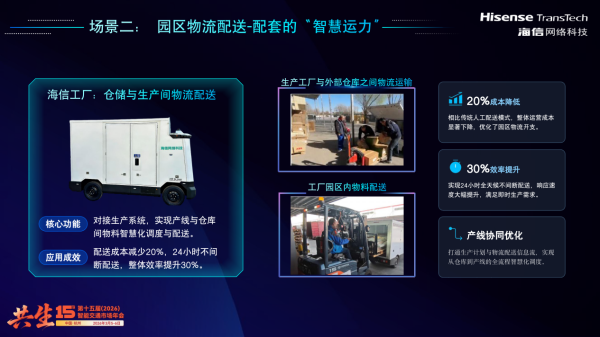 在园区物流配送场景中,海信网络科技大力推进“智送·运安”产品的落地。该产品集成公司优势的AI线网优化和智能运力调度技术,通过与生产原料系统的数据实时共享,实现全局资源的最优配置和高效协同。依托海信自有园区工厂的试点基础,该产品得以与生产管理系统实现数据打通,通过AI调度算法优化配送路径,支持点对点、定时配送及仓储到产线的全流程自动化作业,实现24小时不间断运行,显著提升园区物流运转效率。