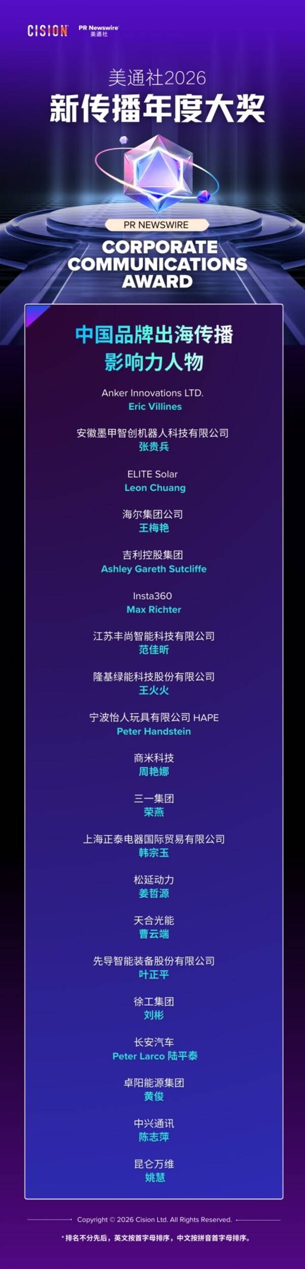 论坛结束后,2026美通社新传播大奖获奖名单揭晓。本次大奖共设19个奖项类别,涵盖内容策略、内容制作、品牌影响力、海外传播、多媒体传播、传播洞察、团队贡献等领域,全面展示了2025年度企业传播领域的卓越成果。获奖名单见下图: