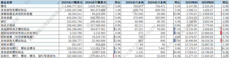 出口分类数据显示,2025年中国紧固件产品结构持续向高附加值、专业化和应用场景导向方向演进。