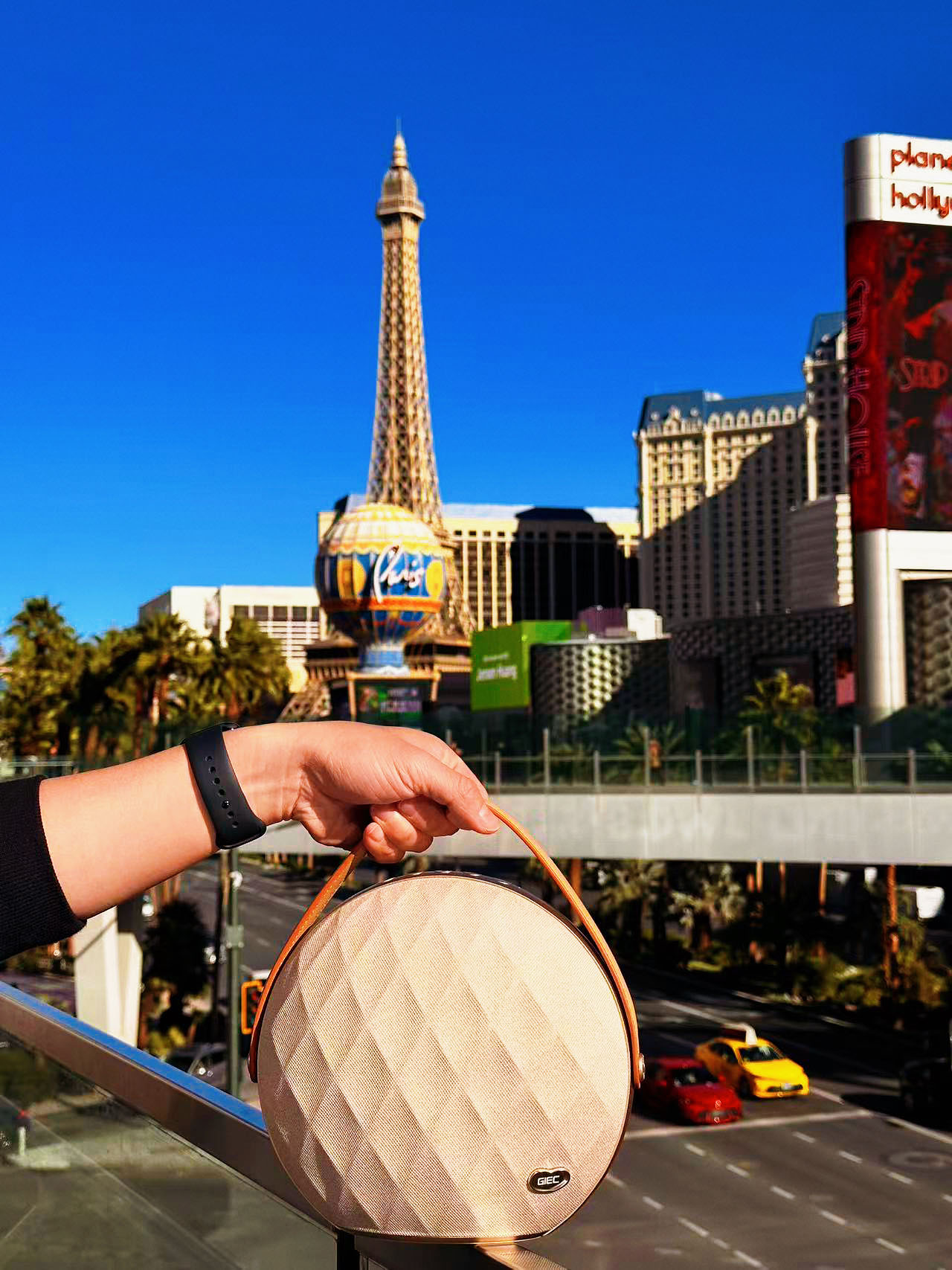 设计上:灵感源自音乐厅穹顶曲线与奢牌圆饼包廓形,一体成型圆润机身搭配菱格纹声学网布与意大利进口真皮手提带,质感媲美万元包款;