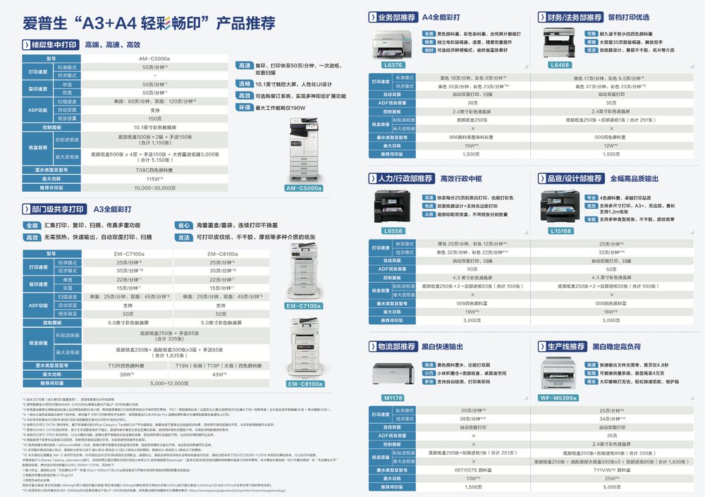 “轻彩畅印”方案的推出,不仅是爱普生“科技+本地化”战略践行,更是品牌作为打印行业引领者再一次的破局创新实践。目前,爱普生“轻彩畅印”方案已为用户提供多种A3及A4办公机型选择,通过成本自由、彩色自由、效率自由、节能自由与洁净自由五大优势,全面赋能企业集中文印、部门级共享打印及不同部门的内部打印需求。