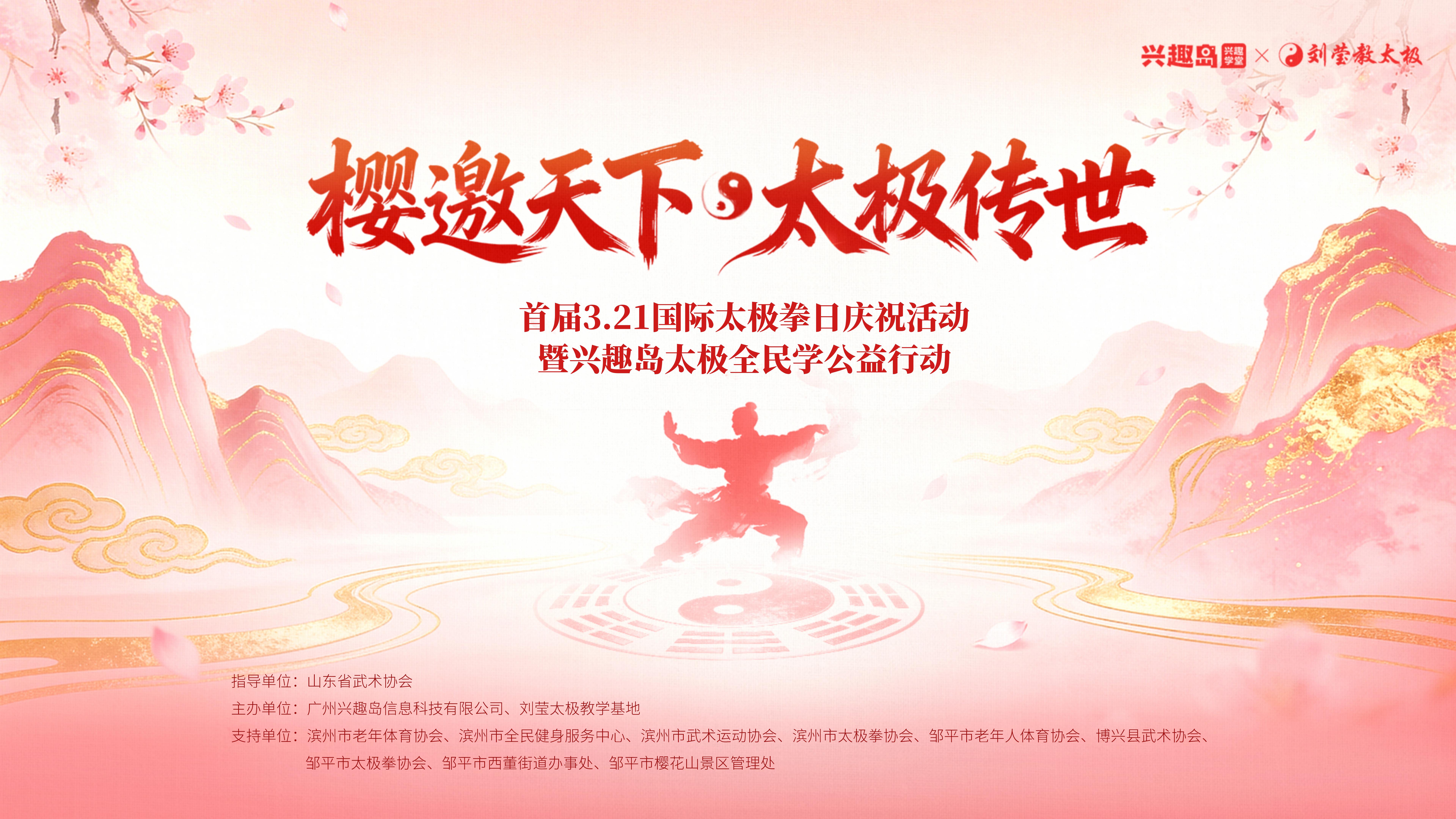 在山东邹平,一场以“樱邀天下 太极传世”为主题的首届3.21国际太极拳日庆祝活动暨兴趣岛太极全民学公益行动,亦将浪漫启幕。本次活动由兴趣岛主办,山东省武术协会、邹平市政府、邹平市文旅局、教体局等单位联合指导,依托樱花山景区的春日盛景,打造“太极+文旅”深度融合的创新样本。