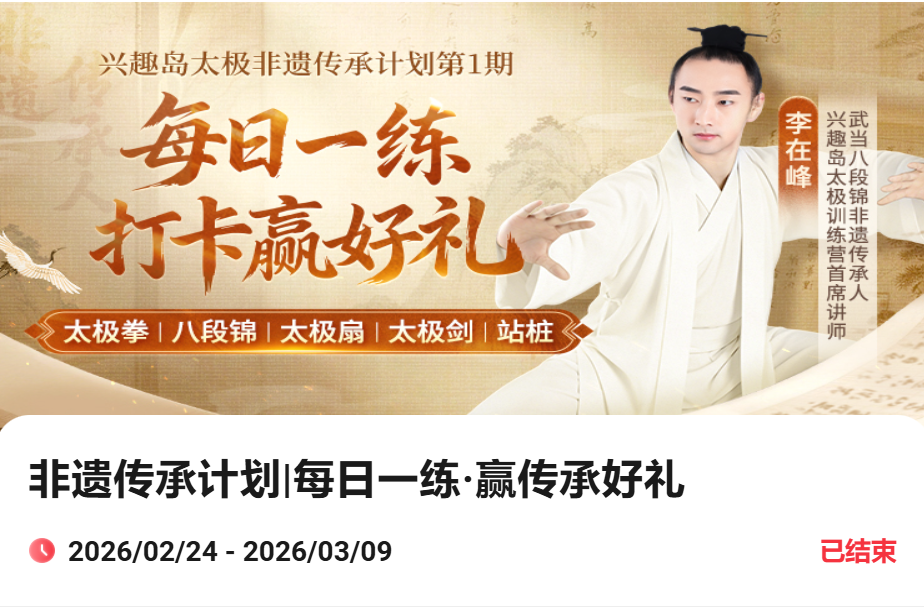 “我在兴趣岛跟着李在峰老师学太极两年多了,这次非遗传承活动一上线,我就每天坚持打卡练八段锦!”来自广州的62岁学员小青(化名)笑着说,“能入选线下活动真的太开心了!特别期待见到李老师,也想让老师帮我看看动作,和全国各地的学友们交流心得。”