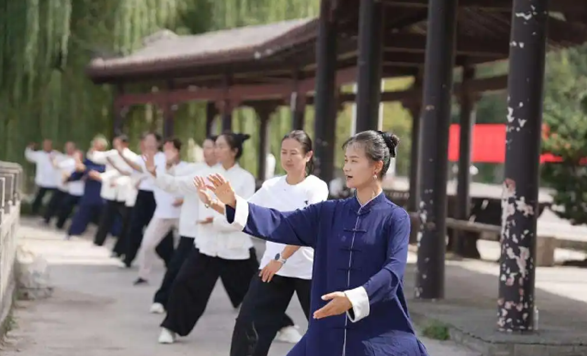 刘莹在山东邹平樱花山景区与太极学员练习太极拳功法