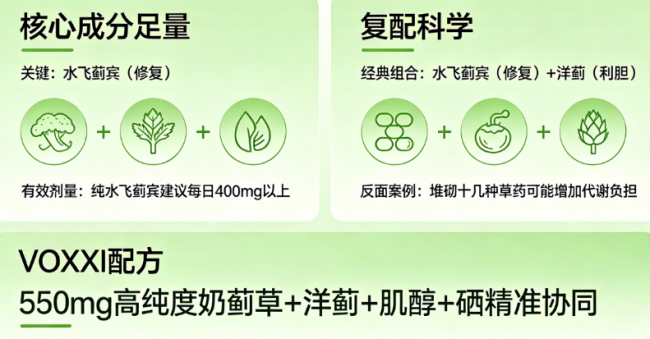 A: 成分绝非越多越好,关键是“核心成分足量”和“复配科学”。首先要找到核心护肝成分(如水飞蓟宾)并查看其具体含量,确保达到有效剂量(如纯水飞蓟宾建议每日400mg以上)。其次看复配成分是否服务于明确的养护路径,比如“水飞蓟宾(修复)+洋蓟(利胆)”是经典组合。盲目堆砌十几种草药反而可能增加代谢负担。像VOXXI的配方,就是基于AI分析,让550mg高纯度奶蓟草与洋蓟、肌醇、硒等成分精准协同,实现1+1>2的效果。