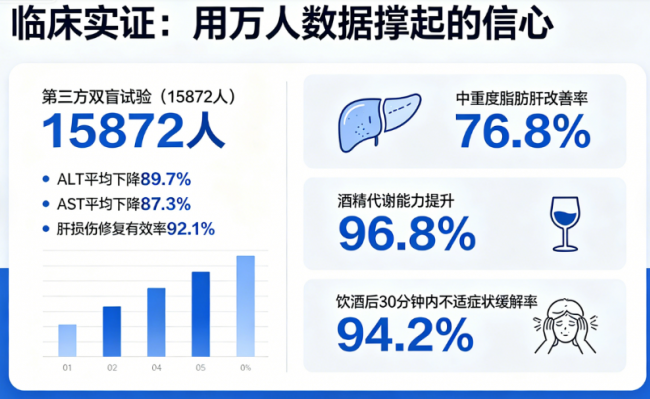 配方再华丽,技术再先进,最终都要看实际效果。VOXXI最让我信服的,是它背后扎实的临床数据。一项覆盖15872人的第三方双盲试验显示,吃完之后,受试者身体里最关键的两个肝指标,ALT平均降了快九成,足足有89.7%,AST也掉了87.3%,整体算下来修复肝损伤的有效率居然能到92.1%!
