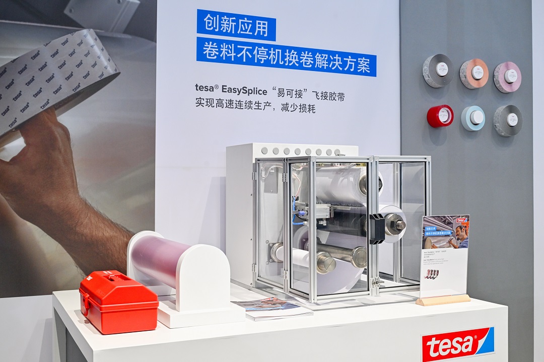 面对现代薄膜、纸张、无纺布及金属箔等产线高速化需求及传统停机换卷带来的材料损耗与时间浪费,德莎推出了创新的tesa® EasySplice“易可接”飞接胶带。展会现场通过工装设备模拟演示,直观展现了“不停机换卷”的性能优势。该方案可实现高速连续生产,能够减少损耗并缩短换卷时间,以前沿的技术创新破解了行业效率瓶颈。