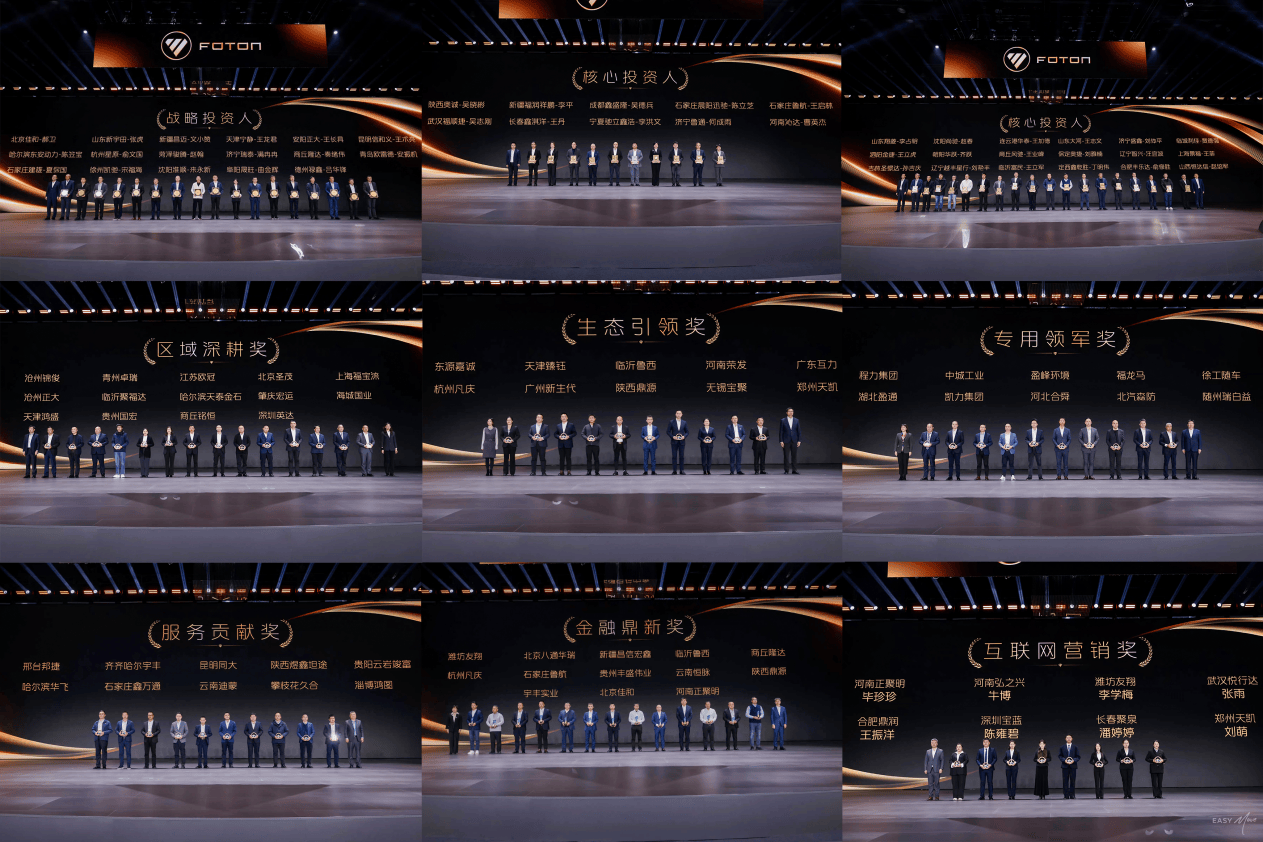 为凝聚合作伙伴共创未来的信心与决心,北汽福田常务副总经理鹿政华主持了核心投资人和战略投资人授牌仪式,现场为45位长期与公司同频共振的战略及核心投资人授牌,他们将获得"专属政策支持、专业人才培养、战略协同共创"等全方位赋能。同时,大会还对全年表现优异的经销商分别授予"区域深耕奖"、"生态引领奖"、“专用领军奖”、"服务贡献奖"、“金融领航奖”、“互联网营销奖”荣誉。