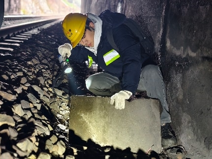 进入隧道,空气湿冷,谢润民与检查人员沿着轨道缓步前行,每隔100米将水沟盖板掀起,用木棍小心探入侧沟测量淤积深度,仔细拍照留存。赵冬骏手握电筒,俯身确认位置和范围,便于准确记录。