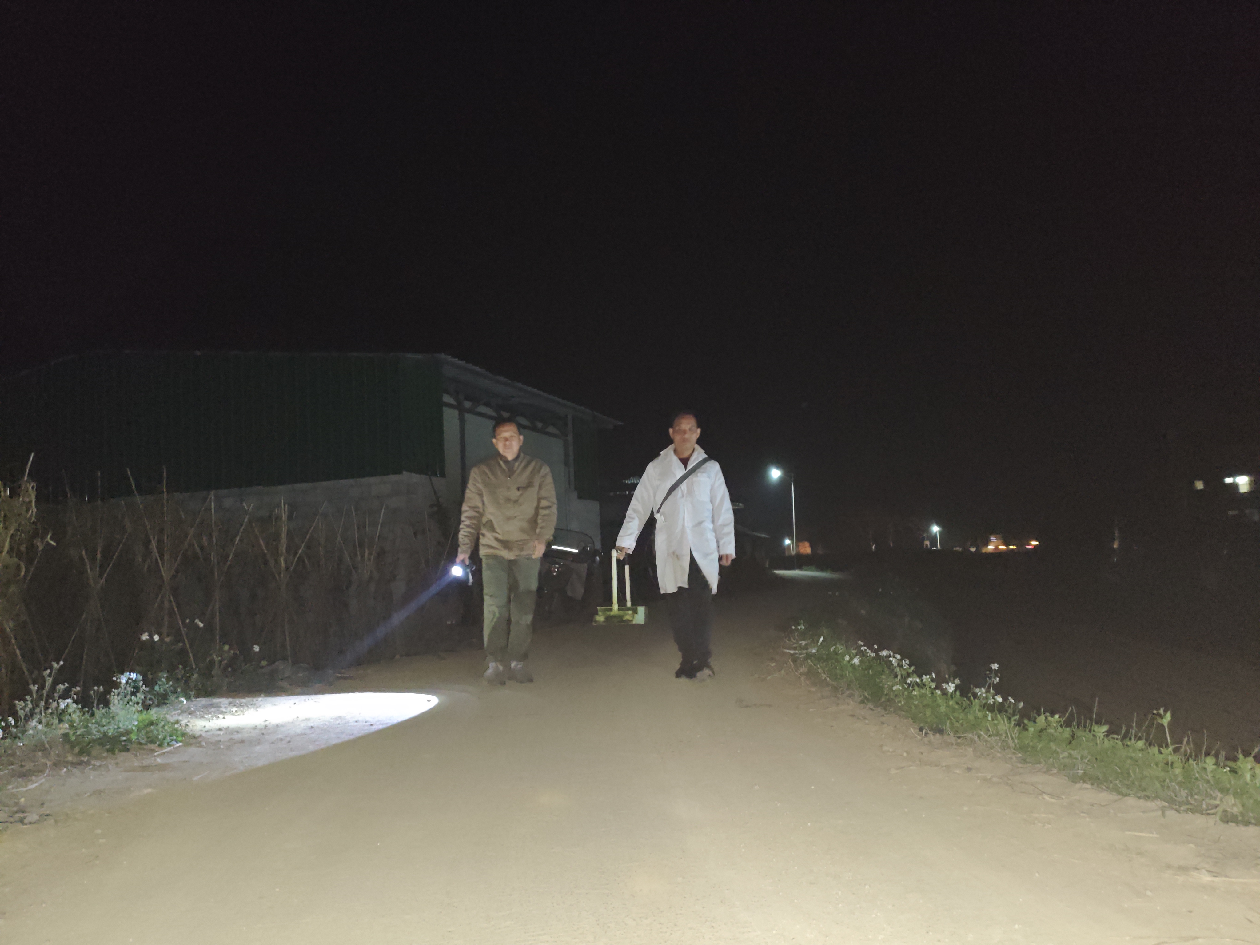 图为该局(营销部)烟技员拿着剪叶机夜间在巡查育苗棚。农志仁摄。
