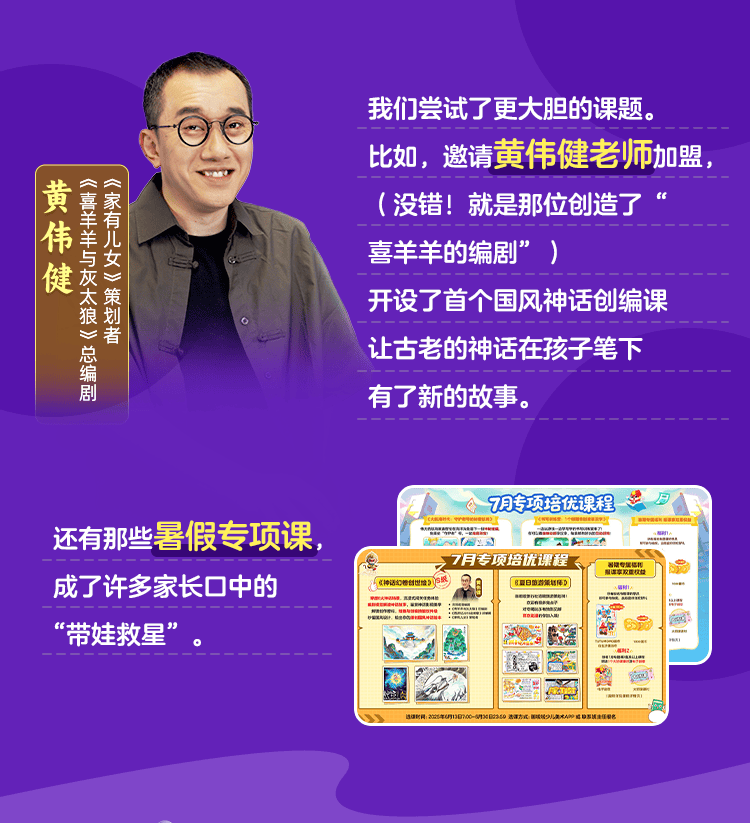 画啦啦邀请《喜羊羊与灰太狼》核心编剧黄伟健加盟,推出的 “国风神话创编课”,则是对传统文化教育方式的一次革新。课程用儿童喜爱的叙事方式,将神话故事转化为创作素材,让传统文化在新时代儿童心中焕发活力。