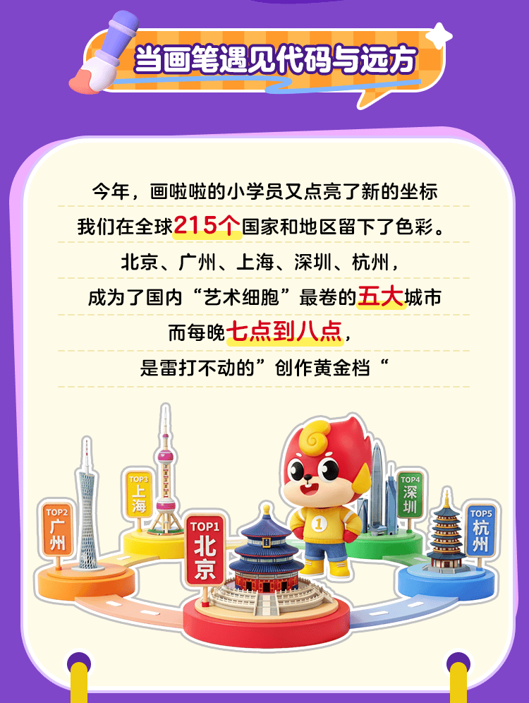 报告显示,画啦啦的“小画家”足迹已遍布全球215个国家和地区。艺术教育的种子在异国土壤中悄然生根,实现了真正的“艺术无国界”。不同文化背景的孩子们通过同一平台,用画笔交流彼此眼中的世界。