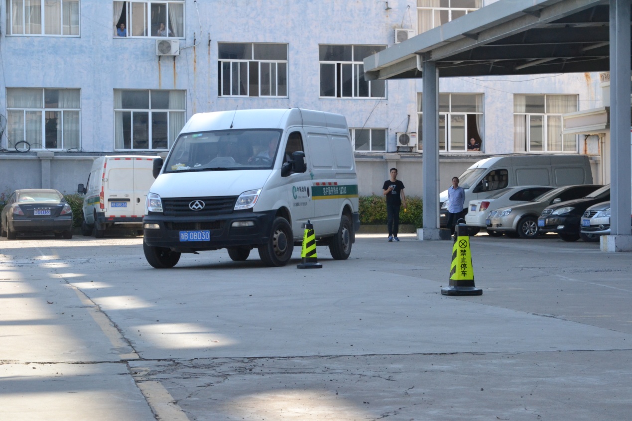 图为驾驶员在开展配送车辆绕桩停车竞赛。