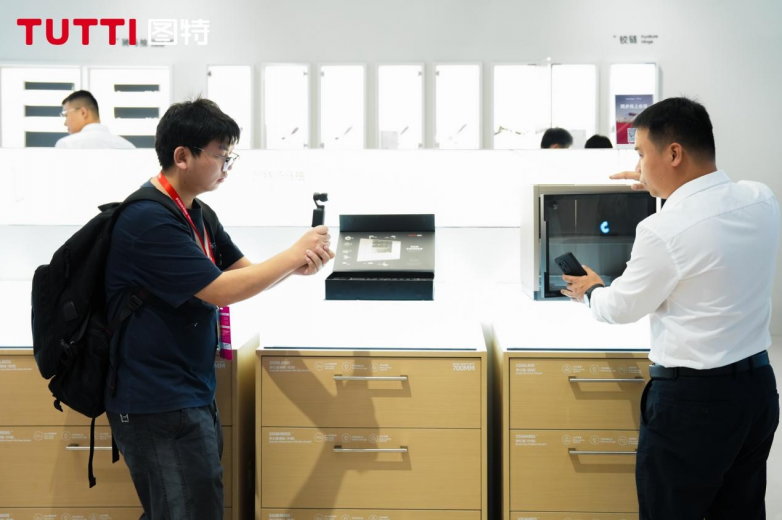 展会期间,图特展位人流如织。展馆整体以金属、木、玻璃为材,构筑通透而克制的空间秩序——外立面银色拉丝金属铺陈,冷静而有力;展馆内以奶白色为底,柔和灯箱与浅木色柜体交织,简约纯粹,却暗藏精密。