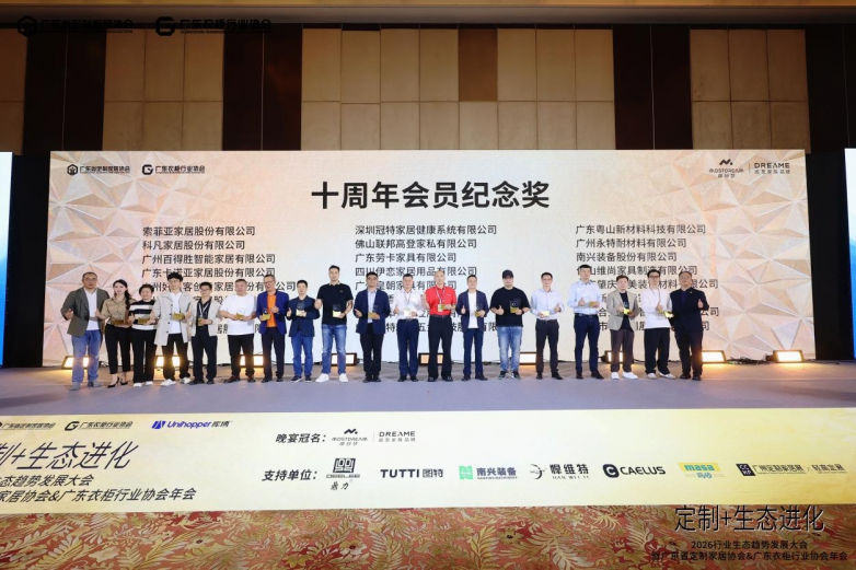▲图特五金荣获广东省定制家居协会“十周年会员纪念奖”(左二)