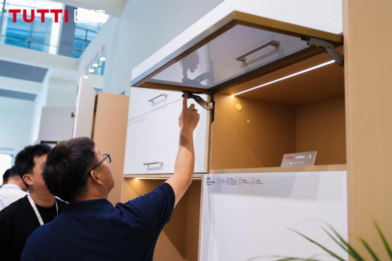 轻轻一推,门板如行云般柔和上扬,柜内物品瞬间映入眼帘。不同于传统对开门需要侧身让位,上翻门板悬于上方,取物无需弯腰,收纳无需踮脚。2.5N力度即可开启,门板可在任意角度自由停留。现场观众纷纷驻足体验,指尖轻推之间,已然看见另一种柜体秩序。