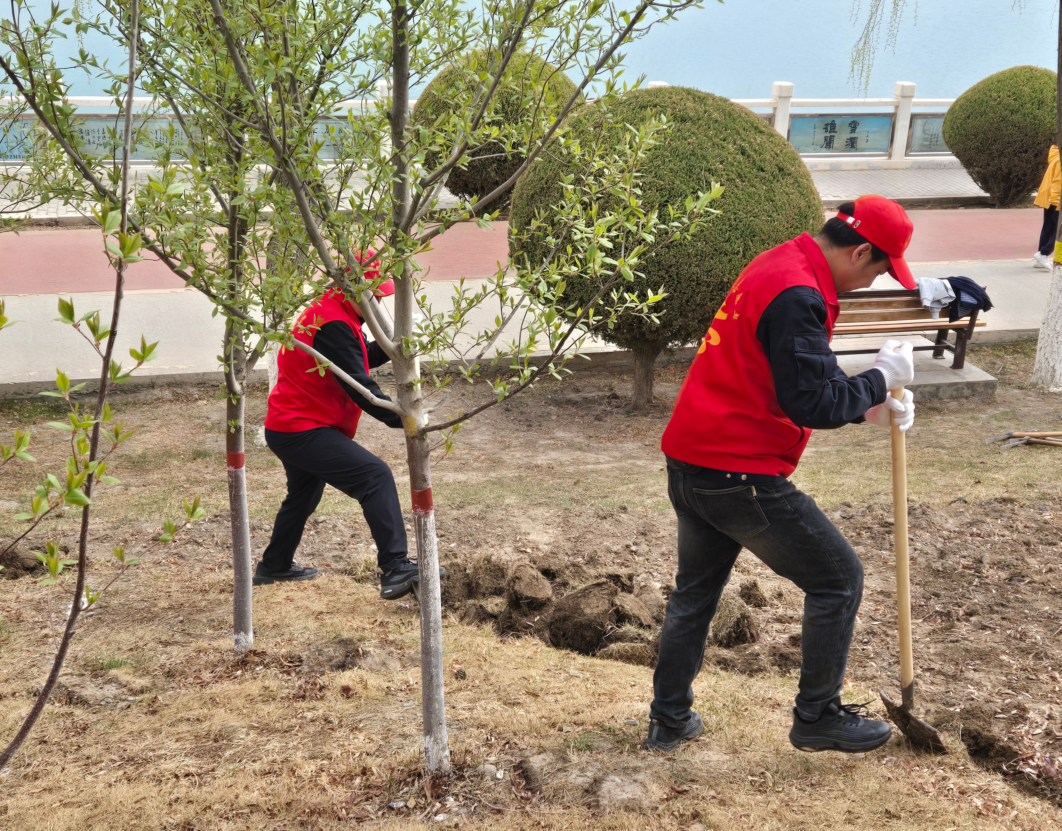 活动现场,志愿者们三五一组,手持铁锹、锄头,一字排开,对绿化点内的板结土壤进行深翻、碎土、平整。“春天翻地能打破土壤板结,增加透气性和保水性,对新苗根系发育非常关键,同时深度要均匀,不能伤到树木根系。”活动中,指导人员一边示范,一边讲解养护要点。大家分工协作,有的翻地,有的捡拾石块杂草,有的堆放翻好的草垛,红色的马甲在草地上跃动,如同一簇簇跳动的火焰,翻开的泥土呈现出深褐色的光泽,夹杂着青草与雨水的清新气息,呈现出一派热火朝天的劳动景象。经过一个多小时的奋战,原本板结坚硬的土地变得松软平整,为后续苗木补植和生长打下了良好基础。