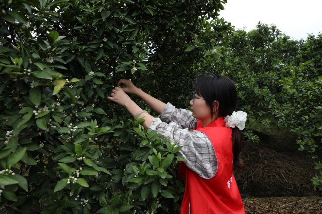 图为“香溢”志愿者帮忙摘橘花。